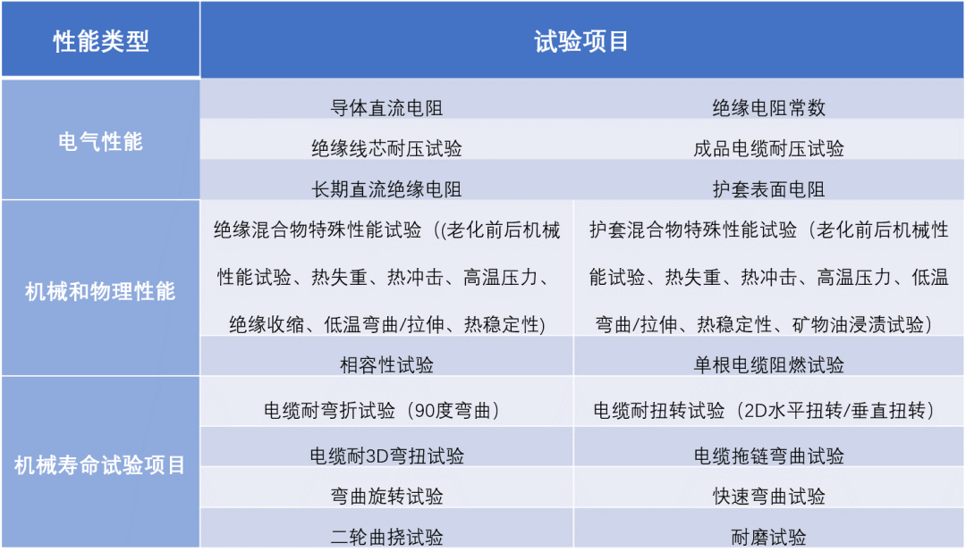 以上标准中规定的电缆的性能测试项目包括三大类,分别是电气性能试验、物理性能试验、机械寿命试验,下图展示的是对具体的性能测试项目的分类汇总。