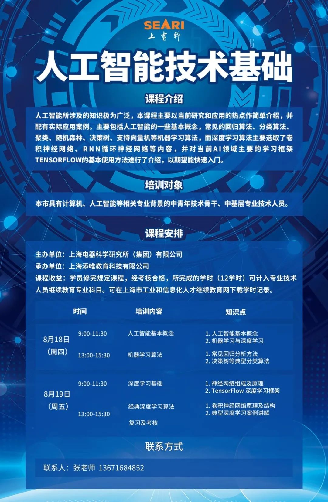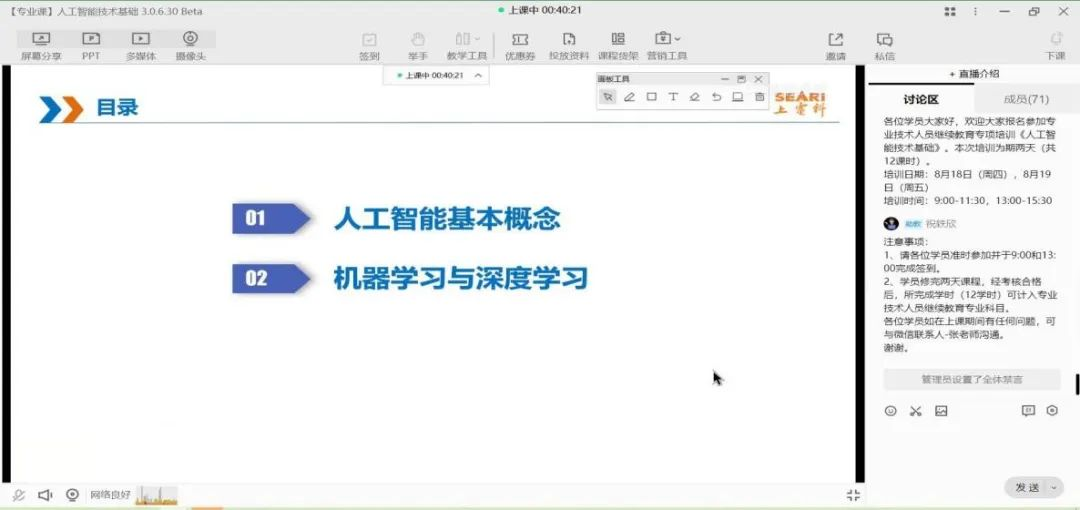 8月18日-8月19日,上海电器科学研究所(集团)有限公司举办的《人工智能技术基础》(第一期)专业课顺利开班。