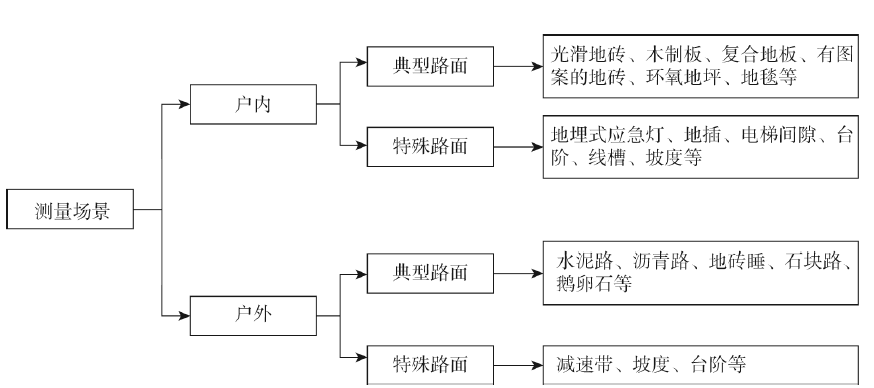 a用户使用场景:充分调研服务机器人的用户使用场景,使用场景包括不同的行走路面、越过障碍物、沟槽等,根据使用场景确定测量场景。