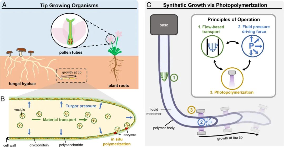 “我们受到了植物和真菌生长方式的启发,”该论文的第一作者、博士生马修·豪斯拉登 (Matthew Hausladen) 表示“植物和真菌在它们的身体末端生长,无论是在根尖还是在它们的新芽处,这项工作可将其转化为工程系统。”