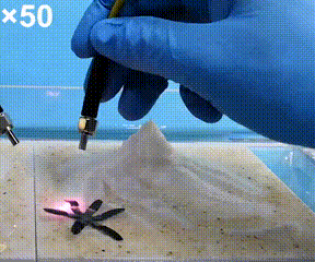 得益于界面扩散聚合(IDP)策略对凝胶结构的编程,只有两只脚的机器人可进一步仿生进化出六只触手!看起来像只小海星。
