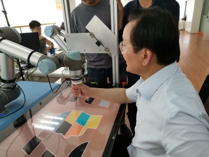 上海大学课题负责人郭帅教授就国家科技部重点研发计划课题的进展情况向徐校长一行进行了工作汇报。徐校长认真听取课题进展及样机研制情况汇报,并亲自体验下肢康复机器人的触觉感知、空间定位、动作捕捉等功能模块,以及上肢康复机器人的阻抗控制技术实现了融合在任务目标中的认知训练等康复策略。